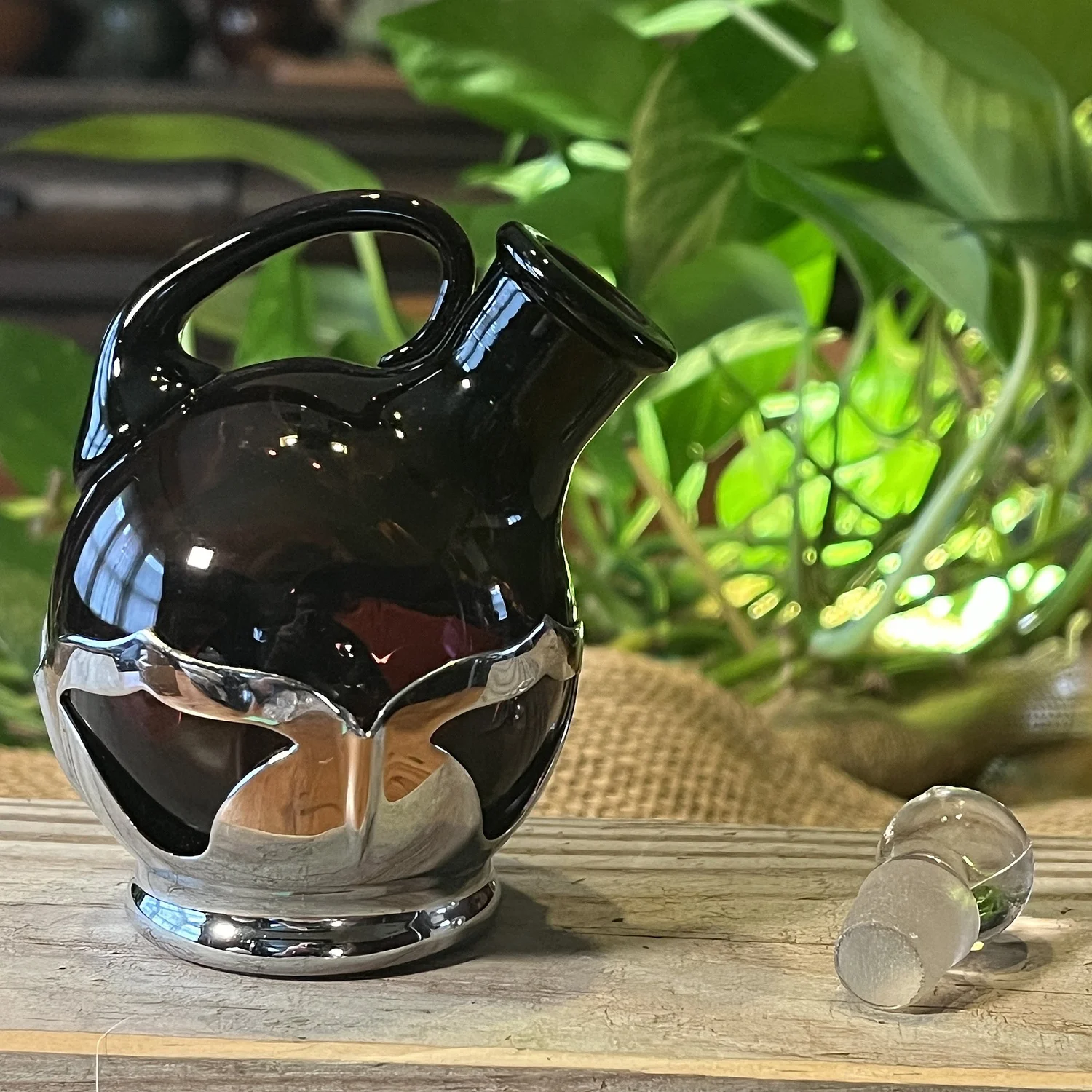Vintage—Farber Bros. Krome-Kraft amethyst cruet bottle with original frosted glass cap, 4” tall, approximately 2.5” diameter at widest point. Manufactured between 1915 and 1950. No chips or cracks. No peeling chrome. Excellent condition.