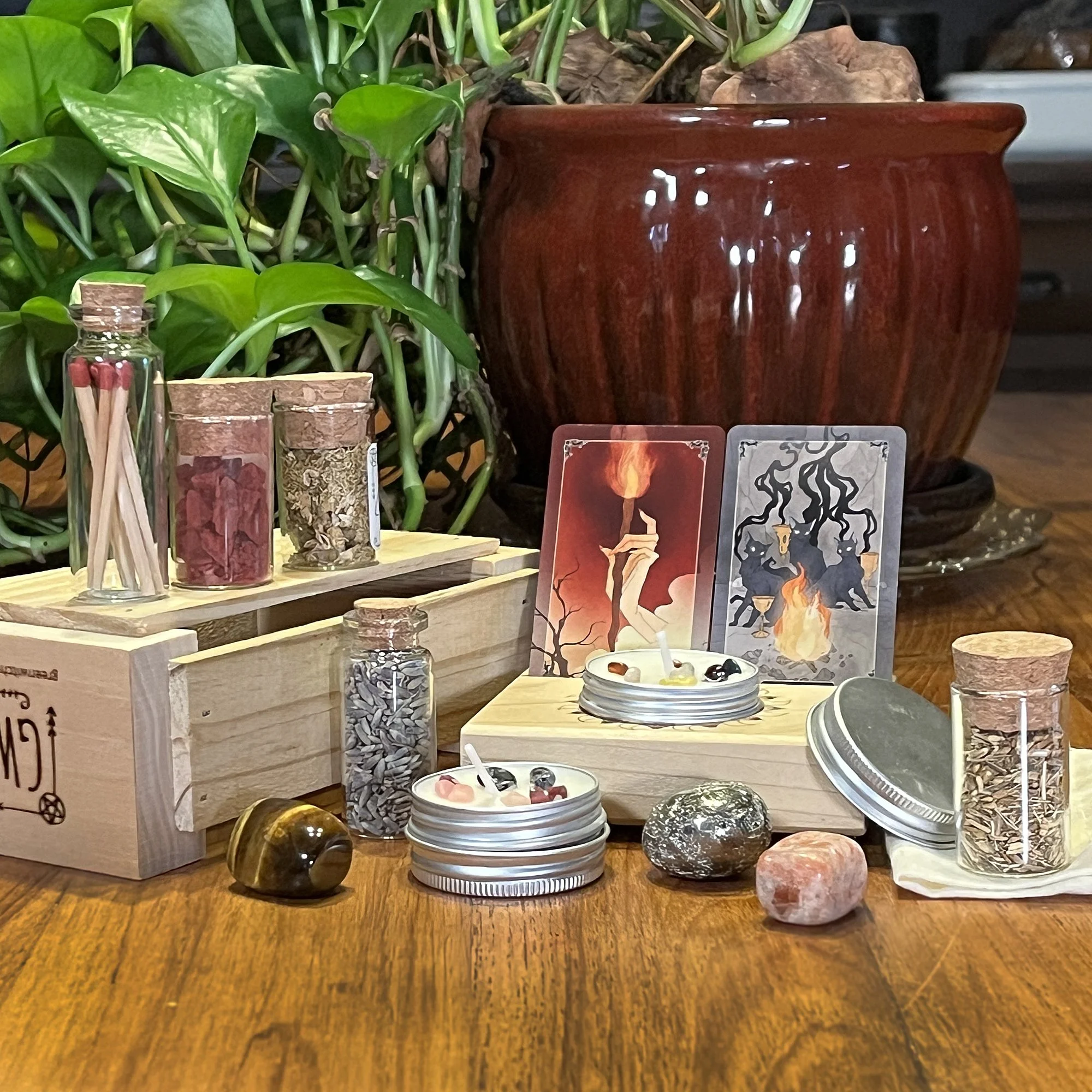 Midsummer is all about celebrating the light half of the year, enjoying the season's abundance and warmth, and looking forward to the harvest. It's a great time for divination work, so our Midsummer Celebration Set contains a handmade one-card tarot & oracle card stand along with tealight candles to use during divination and matches to light them (CARDS NOT INCLUDED). The card stand even includes our very own solar design around the tealight holder! You'll also find herbs, crystals, and other Midsummer-correlated tools to help you celebrate.